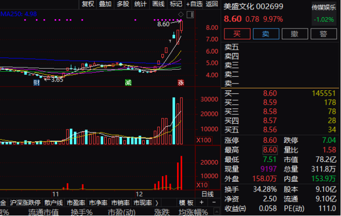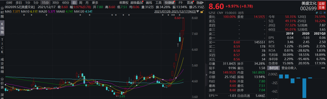 此外,近期独董行为引起投资者关注的美盛文化也发布股票异常波动的告,公告称,公司主营业务收入来自于IP衍生品、动漫玩具以及广告发行业务。公司股票近期涨幅较大,市盈率较高,请广大投资者注意二级市场交易风险。此外,公司目前存在控股股东非经营性资金占用情况。不过这些并未妨碍其股价连续大涨,最近9个交易日股价翻了一倍。