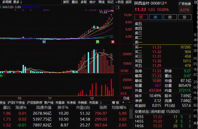 陕西金叶自11月下旬以来总体连续上涨,19个交易日里收获了13个涨停板,已经较11月低位暴涨超过260%,最近更是连续5个交易日涨停。
