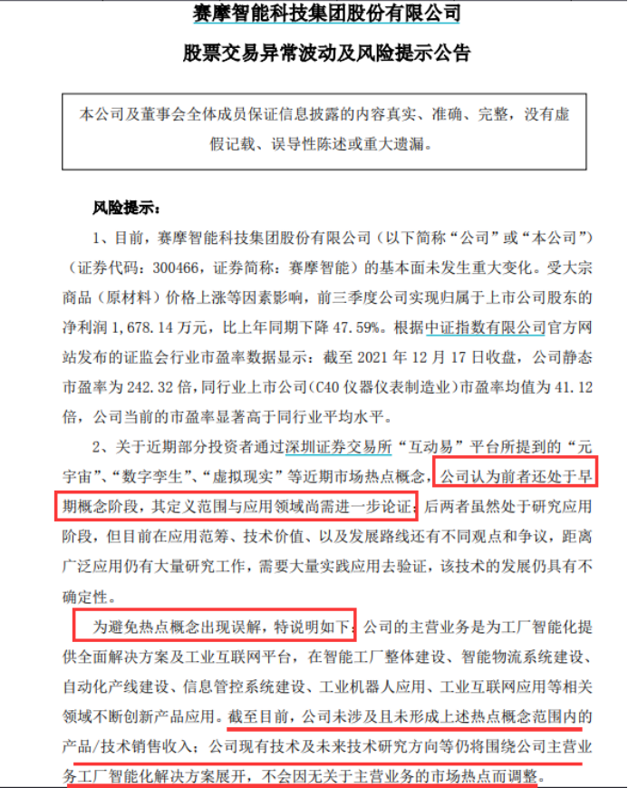 有公司甚至提醒投资者要避免对热点概念出现“误解”。根据赛摩智能晚间的公告,公司称,关于近期部分投资者通过深圳证券交易所“互动易”平台所提到的“元宇宙”、“数字孪生”、“虚拟现实”等近期市场热点概念,公司认为前者还处于早期概念阶段,其定义范围与应用领域尚需进一步论证;后两者虽然处于研究应用阶段,但目前在应用范筹、技术价值、以及发展路线还有不同观点和争议,距离广泛应用仍有大量研究工作,需要大量实践应用去验证,该技术的发展仍具有不确定性。