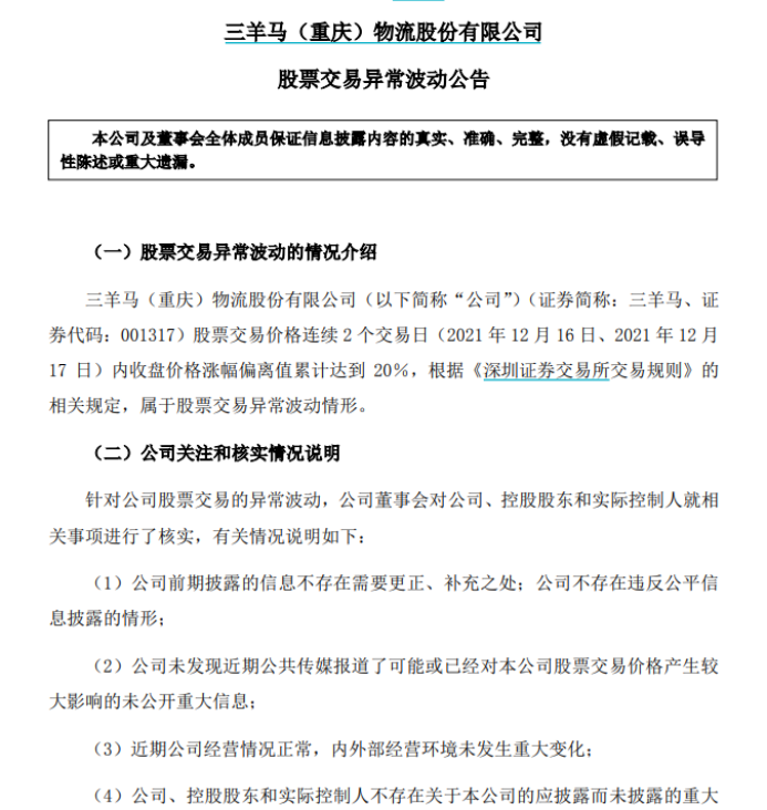 比如近期最牛次新股三羊马发布的股票交易异常波动公告显示,针对公司股票交易的异常波动,公司董事会对公司、控股股东和实际控制人就相关事项进行了核实。公司称,公司董事会确认,公司目前没有任何根据《深圳证券交易所股票上市规则》等有关规定应予以披露而未披露的事项或与该事项有关的筹划、商谈、意向、协议等。