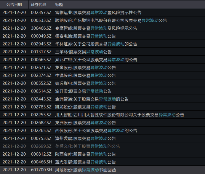 根据19日晚间沪深交易所披露,当晚至少有20家公司披露股票交易异常波动公告。
