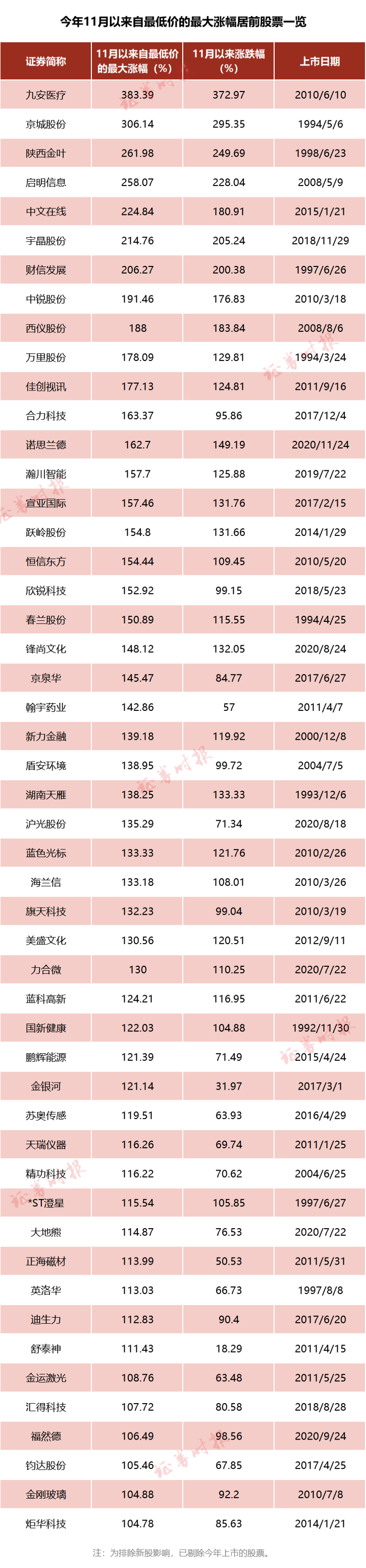 据Wind数据,在剔除今年上市的股票后,11月以来有多达50只股票自最低位股价翻了1倍以上。另据统计,11月以来,有28股涨幅超过100%,其中九安医疗、京城股份、陕西金叶、启明信息、宇晶股份、财信发展涨幅甚至超过200%。