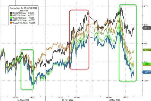 对货币政策更敏感的两年期美债收益率在亚欧时段升破2.73%,美股时段最深下行5个基点,一度失守2.65%。五年期收益率也在上逼3%未果后转跌7个基点,与10年期曲线重新倒挂。