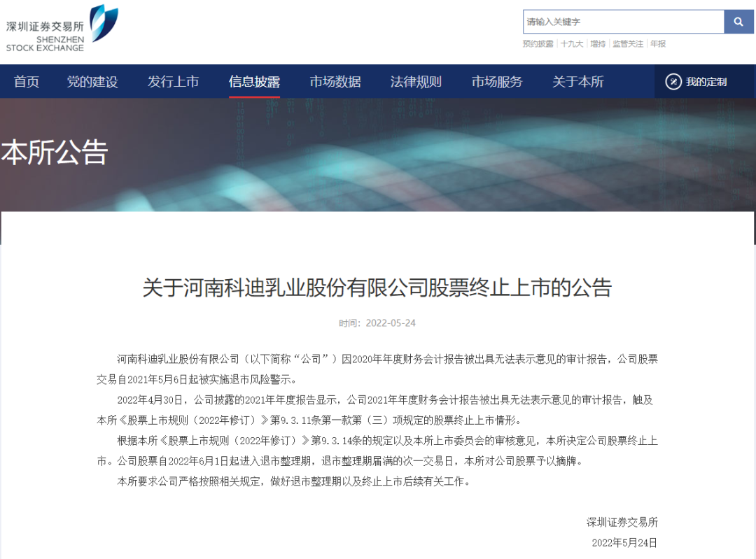 2022年4月30日,公司披露的2021年年度报告显示,公司2021年年度财务会计报告被出具无法表示意见的审计报告,触及深交所终止上市情形。