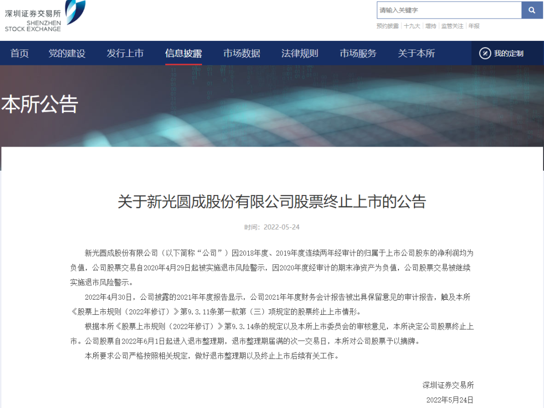 2022年4月30日,*ST新光披露的2021年年度报告显示,公司2021年年度财务会计报告被出具保留意见的审计报告,触及深交所终止上市情形。
