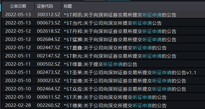 时报君以“听证申请”为关键字进行搜索,截至5月23日,今年以来累计12家A股上市公司向交易所提交了听证申请的公告。