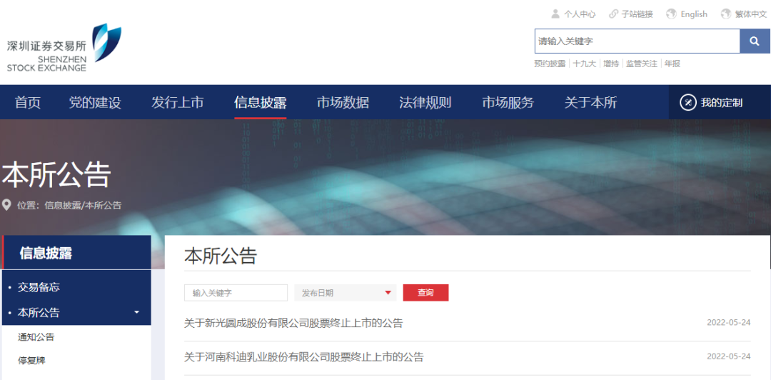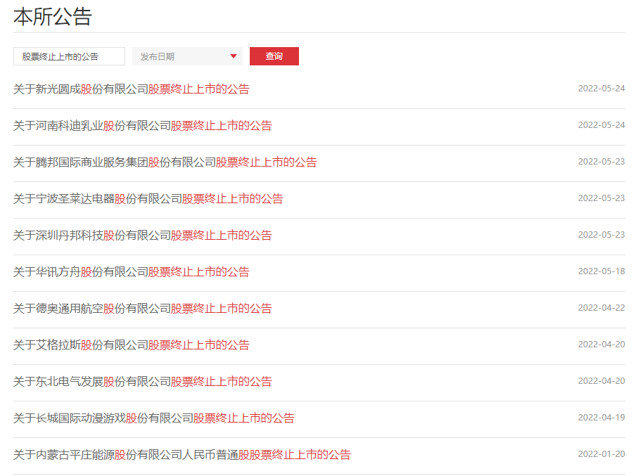 5月24日,深交所官网发布两则关于上市公司终止上市的公告,分别是*ST新光和*ST科迪。以“股票终止上市”为关键字眼搜索,至此,今年以来,深交所已经累计发布了11则相关公告。