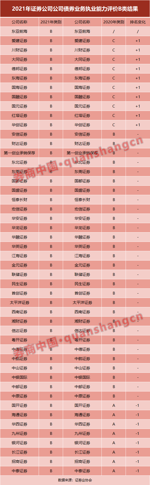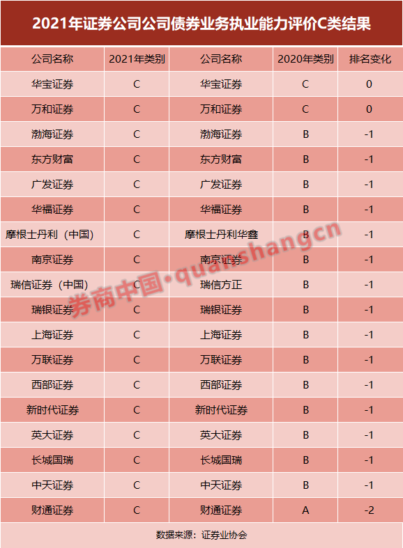 也有券商排名在上升。爱建证券、川财证券、大同证券、德邦证券、东海证券、国海证券、国融证券、国元证券、红塔证券、华创证券合计10家券商均从2020年C类评价上升到今年的B类。