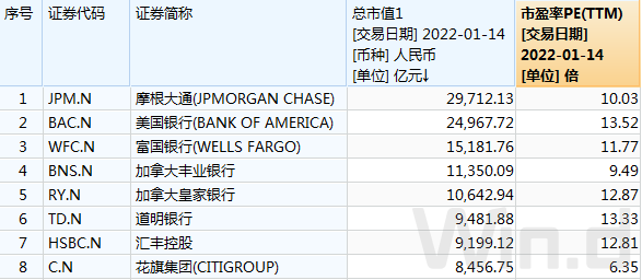 而从美国上市银行估值来看,市值排名居前的银行市盈率均超过10倍,仅加拿大丰业银行和花旗集团市盈率低于10倍。