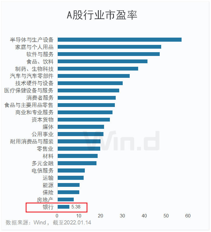 事实上,银行板块长期不受投资者待见,估值水平也是持续在底部徘徊。从当前A股行业市盈率来看,银行板块为5.38倍,估值最低。