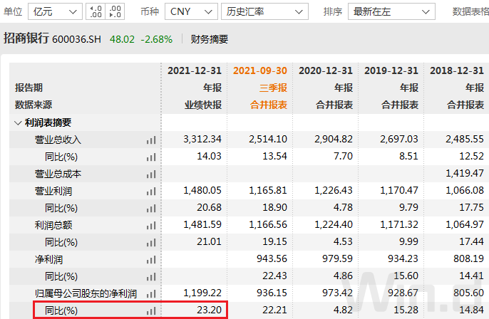 招商银行2022年1月14日晚间发布业绩快报称,2021年归属于母公司所有者的净利润1199.22亿元,同比增长23.2%;营业收入3312.34亿元,同比增长14.03%;基本每股收益4.61元,同比增长21.64%。