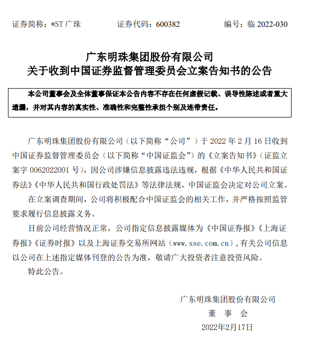 2月16日晚间,*ST广珠发布公告称,公司收到中国证券监督管理委员会(以下简称“中国证监会”)的《立案告知书》(证监立案字0062022001号),因公司涉嫌信息披露违法违规,根据《中华人民共和国证券法》《中华人民共和国行政处罚法》等法律法规,证监会决定对公司立案。