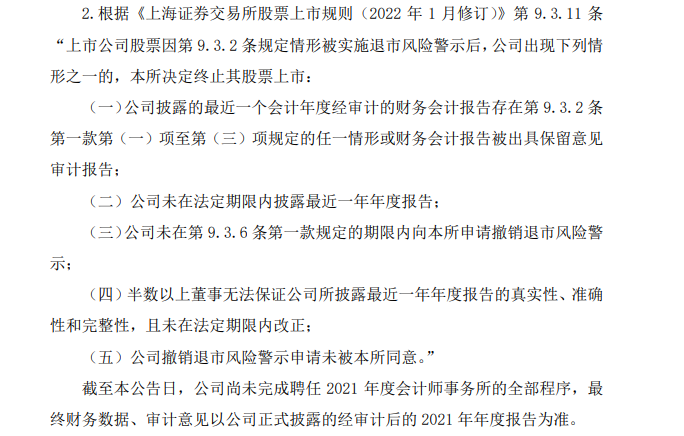 同日晚间,公司还披露一则可能被终止上市的风险提示性公告。公司2020年财务报告被出具无法表示意见的审计报告,公司股票自2021年5月6日起被实施“退市风险警示”处理。