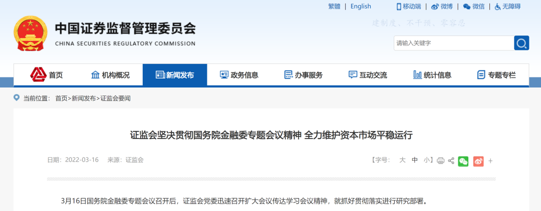 证监会深刻认识到,在当前复杂形势下,国务院金融委召开专题会议,研究当前经济形势和资本市场问题,十分及时、十分重要,体现了对资本市场工作的高度重视,充分回应了市场关切,作出的部署具有很强的指导性和针对性。今年以来,我国国民经济延续恢复态势,主要宏观经济指标运行在合理区间,各方面稳增长政策持续发力,上市公司业绩表现稳中向好,资本市场平稳运行具有坚实基础,市场短期波动没有也不会改变长期健康发展趋势。