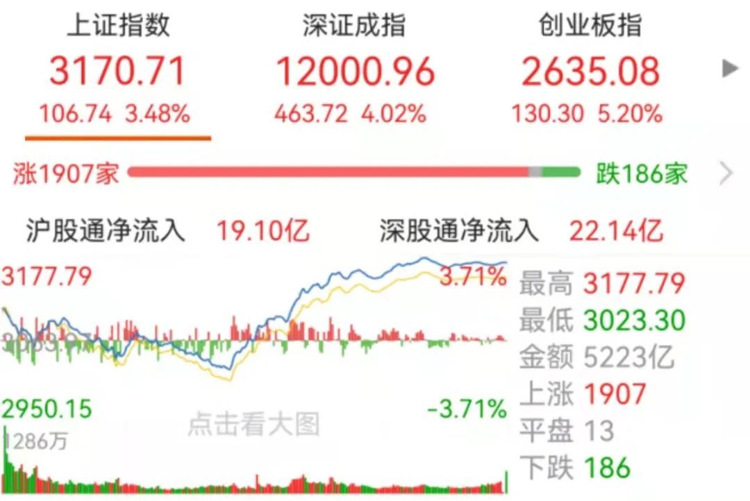截至收盘,沪指涨3.48%,深成指涨4.02%,创业板指涨5.20%。