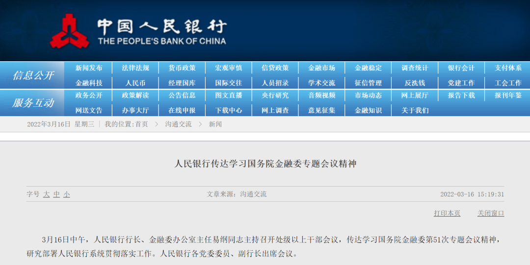 会议要求,人民银行坚决贯彻党中央国务院决策部署,坚决提高政治站位,坚决落实金融委的工作要求,积极担当作为,把中央经济工作会议精神和全国“两会”部署落到实处。坚持以经济建设为中心,坚持高质量发展,坚持深化改革、扩大开放,坚持市场化法治化原则,坚持保护产权和两个毫不动摇。货币政策要主动应对,新增贷款要保持适度增长,大力支持中小微企业,坚定支持实体经济发展,保持经济运行在合理区间。坚持稳中求进,防范化解房地产市场风险,稳妥推进并尽快完成大型平台公司整改工作,促进平台经济健康平稳发展,提高国际竞争力。进一步加强部门间政策协调,及时回应市场关注的热点问题,稳定预期,提振信心,保持中国经济平稳健康发展,共同维护资本市场的稳定发展。