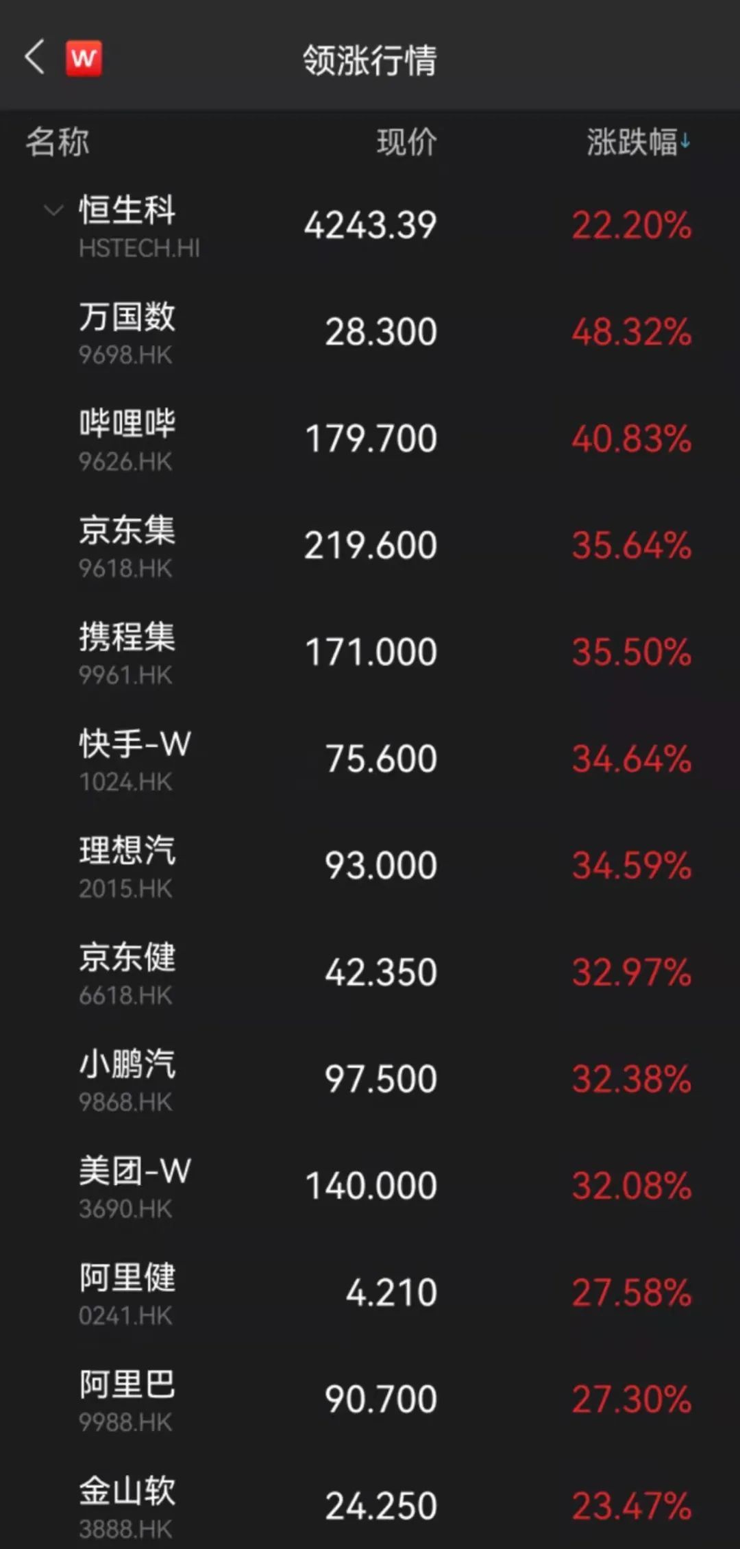 科网股、回港中概股暴涨,餐饮、汽车、体育、医药板块持续升温,房地产、物业管理板块大涨;京东集团涨超35%,美团涨超32%,阿里巴巴涨超27%,腾讯控股涨超23%,香港交易所涨超11%。