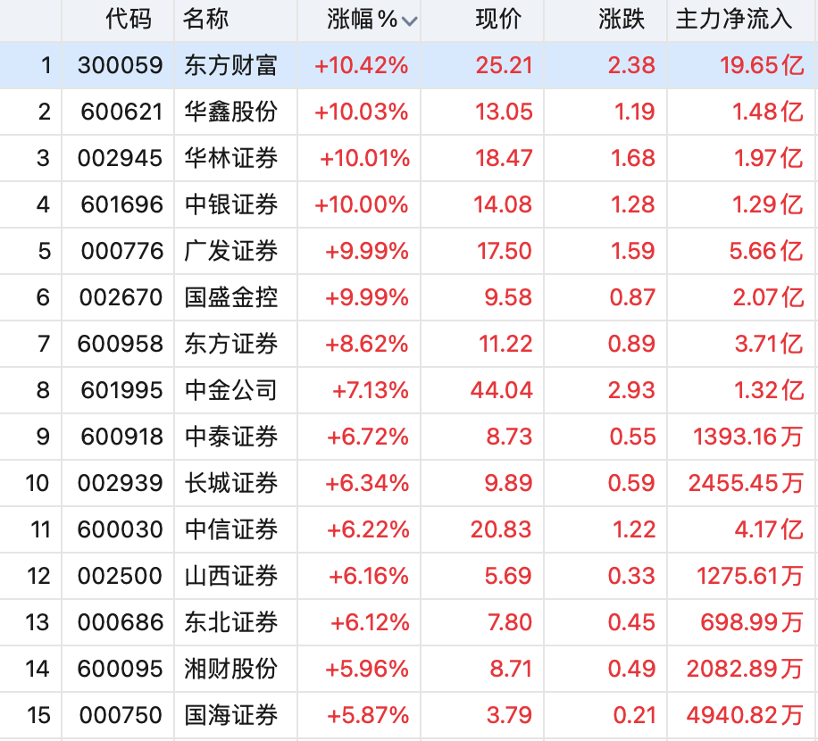 “牛市旗手”券商板块午后强势上攻。华鑫股份、华林证券、中银证券、广发证券、国盛金控涨停,中金公司、东方证券、中泰证券、东方财富等跟涨。