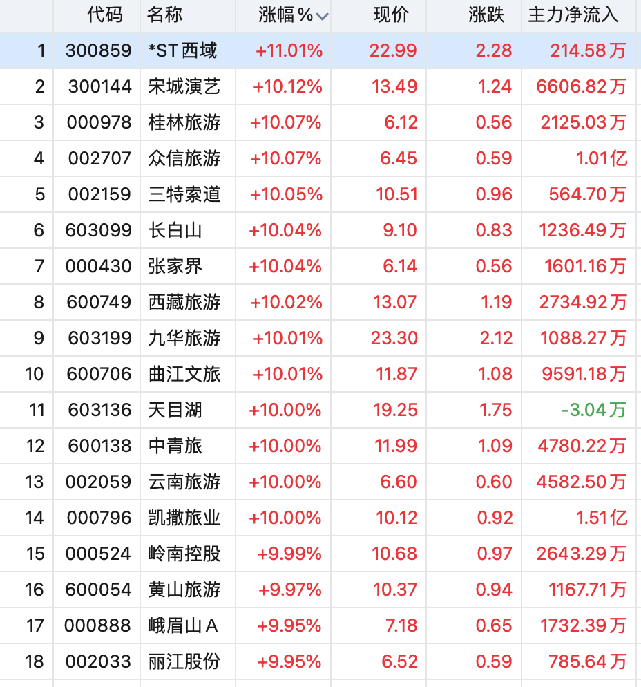 景点及旅游板块掀涨停潮。曲江文旅、中青旅、凯撒旅业等16只个股涨停,板块指数大涨近9%。