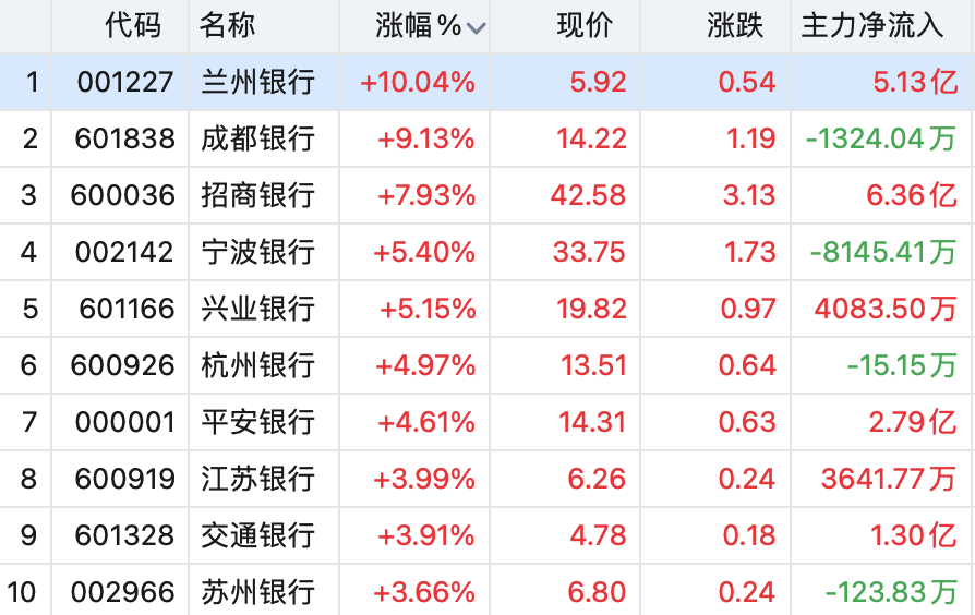 银行板块大涨逾2.8%。兰州银行涨停,成都银行逼近涨停,招商银行大涨近8%,宁波银行、兴业银行、杭州银行等个股跟涨。
